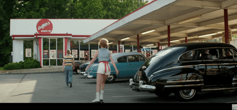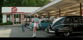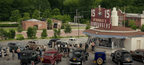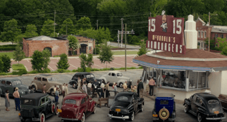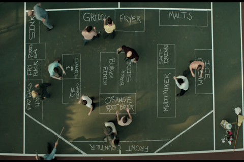 En la siguiente imagen se puede ver al fondo que los hermanos McDonald's se inventaron una feria para atraer al público. Sin embargo, les llovió y la gente se llevó la comida a la casa. Aún cuando el evento fue un fracaso (por la lluvia), la gente compró rápidamente la comida y se la llevó. El mensaje fue todo un éxito, y al día siguiente una multitud hacía fila para comprar las hamburguesas.