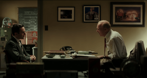 En la siguiente imagen podemos ver a Ray Kroc (derecha) recibiendo el secreto para apoderarse del negocio McDonald's: dado que, por contrato, no podía modificar nada interno del negocio, la solución era apoderarse del exterior, es decir, comprar el suelo donde arrendaban los restaurantes. Y a partir de ahí, ser él quien colocara las condiciones.