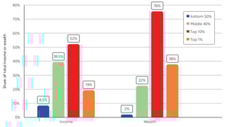 Adicional a ello, este 10% de ricos (barra roja) tiene una mayor participación en los cálculos de la riqueza, y menos en los de los ingresos. Lo cual implica que los percentiles bajos (barra azul) y medios (barra verde) retroceden en su participación (al pasar del análisis de ingresos al de la riqueza).